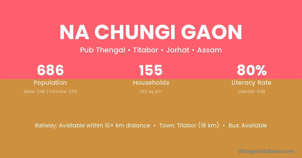 Titabor (18 km) is the nearest town to Na Chungi Gaon village for major economic activities and is located approximately 18 km away.