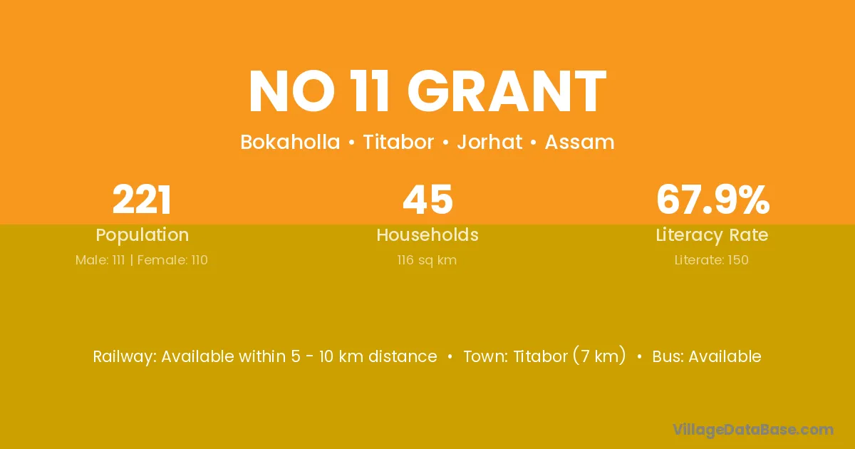 Titabor (7 km) is the nearest town to No 11 Grant village for major economic activities and is located approximately 7 km away.