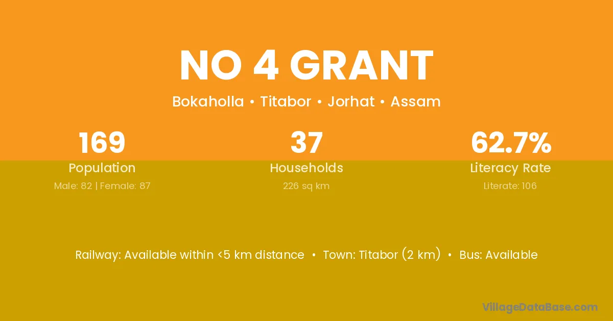 Titabor (2 km) is the nearest town to No 4 Grant village for major economic activities and is located approximately 2 km away.