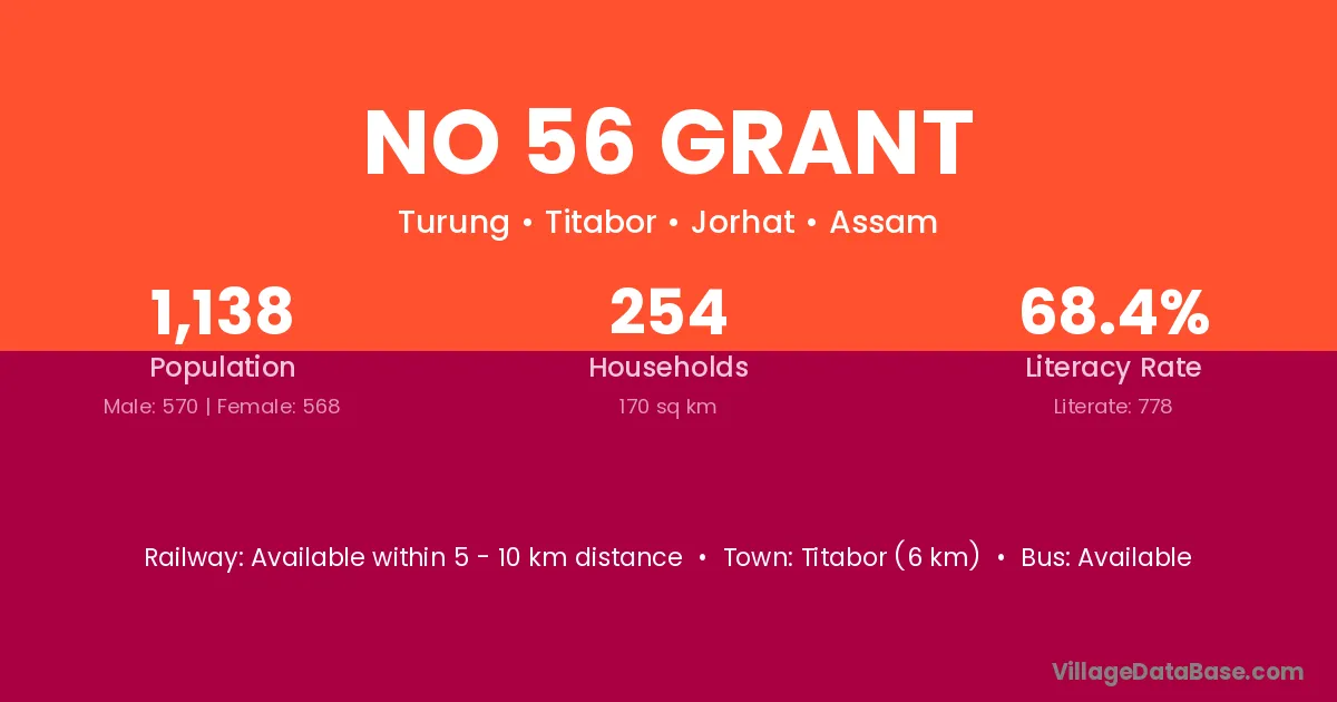 Titabor (6 km) is the nearest town to No 56 Grant village for major economic activities and is located approximately 6 km away.