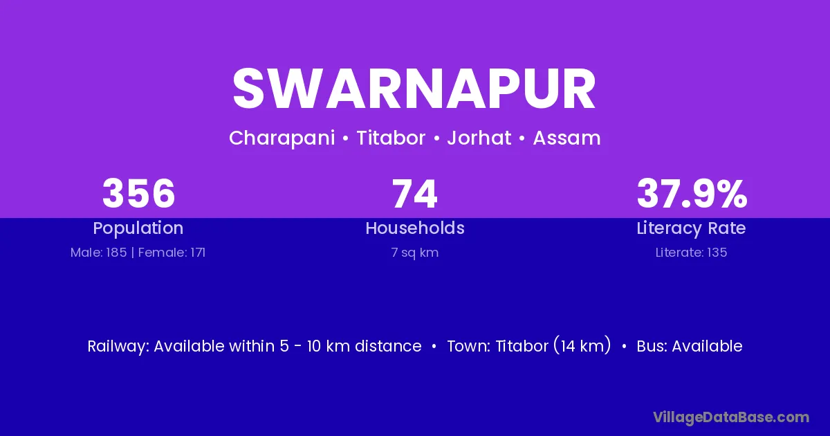 Titabor (14 km) is the nearest town to Swarnapur village for major economic activities and is located approximately 14 km away.