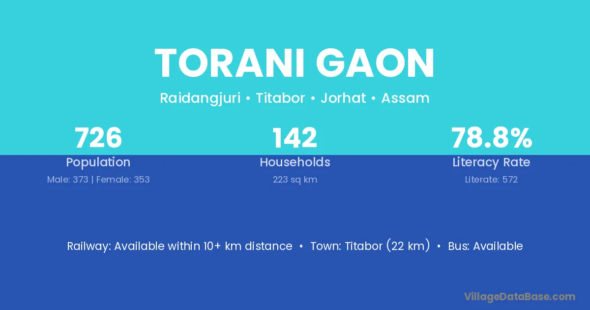 Titabor (22 km) is the nearest town to Torani Gaon village for major economic activities and is located approximately 22 km away.