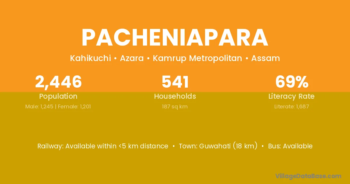 Guwahati (18 km) is the nearest town to Pacheniapara village for major economic activities and is located approximately 18 km away.