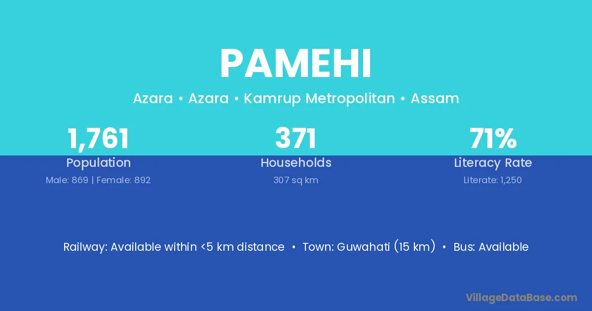 Guwahati (15 km) is the nearest town to Pamehi village for major economic activities and is located approximately 15 km away.