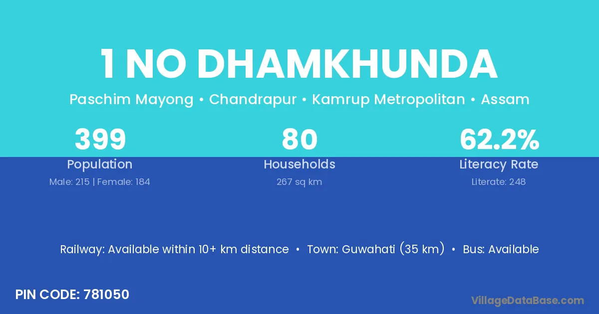 Guwahati (35 km) is the nearest town to 1 No Dhamkhunda village for major economic activities and is located approximately 35 km away.