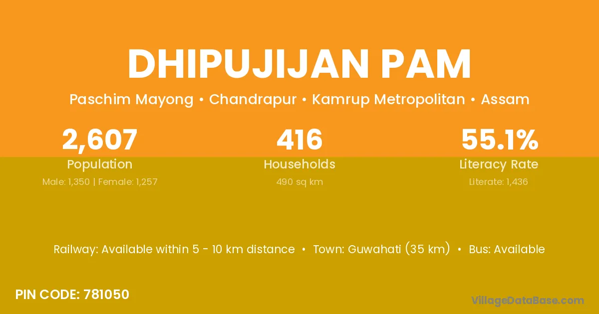 Guwahati (35 km) is the nearest town to Dhipujijan Pam village for major economic activities and is located approximately 35 km away.