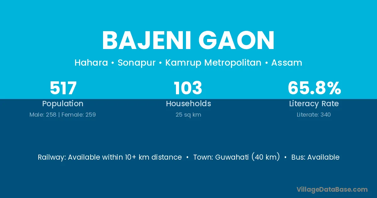 Bajeni Gaon village has a total population of 517 people, of which 258 are males and 259 are females.