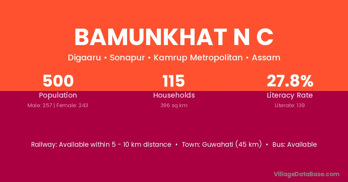 Bamunkhat N C village has a total population of 500 people, of which 257 are males and 243 are females.