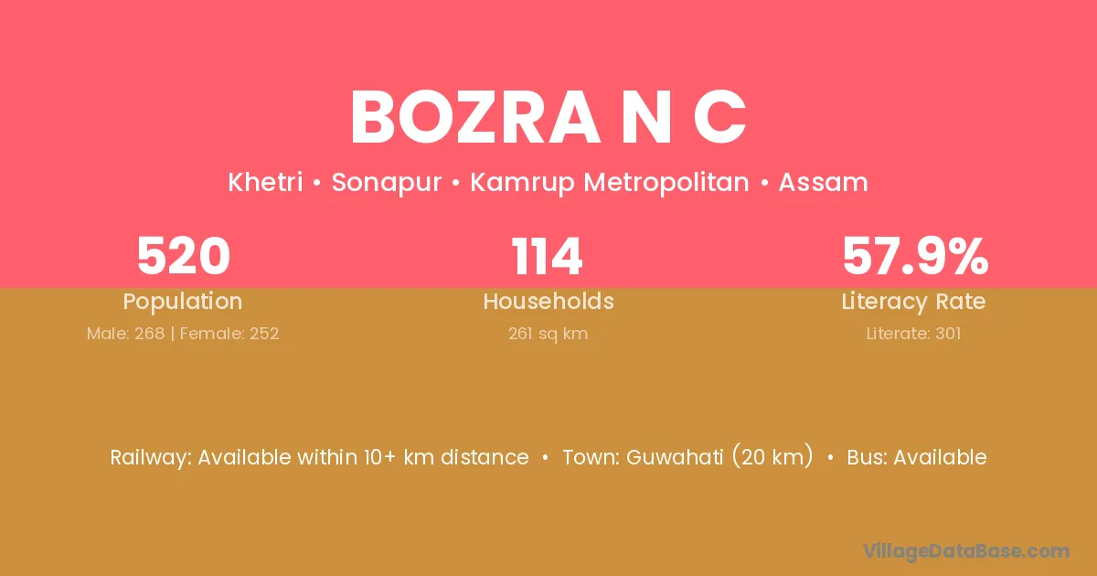 Guwahati (20 km) is the nearest town to Bozra N C village for major economic activities and is located approximately 20 km away.