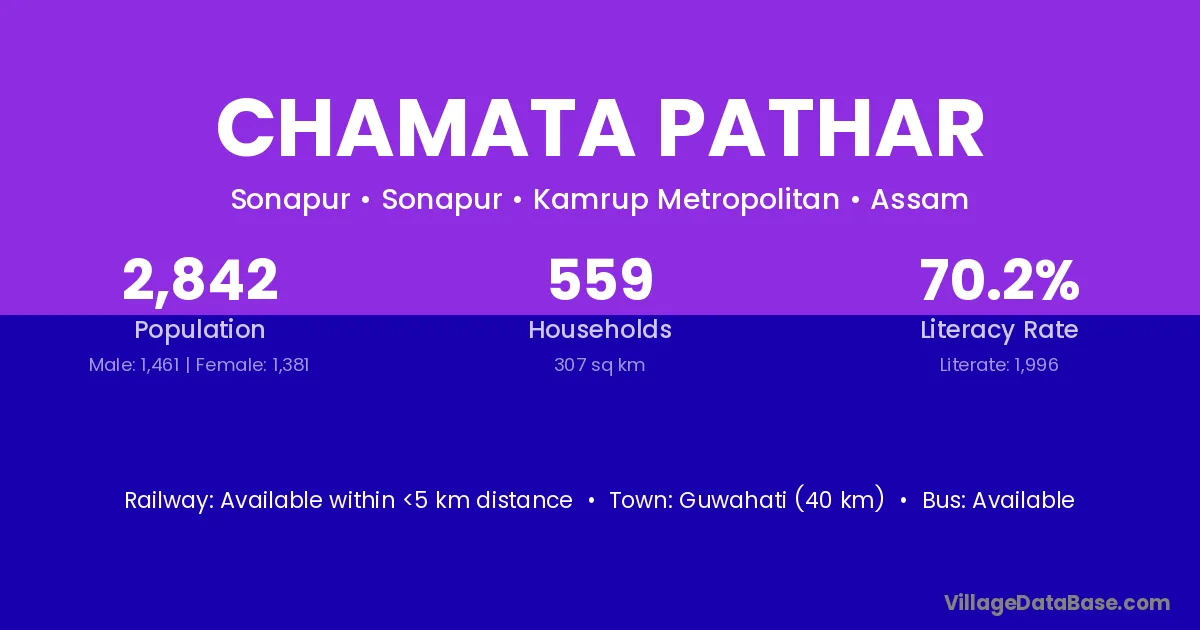 Guwahati (40 km) is the nearest town to Chamata Pathar village for major economic activities and is located approximately 40 km away.