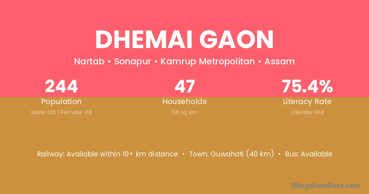 Guwahati (40 km) is the nearest town to Dhemai Gaon village for major economic activities and is located approximately 40 km away.