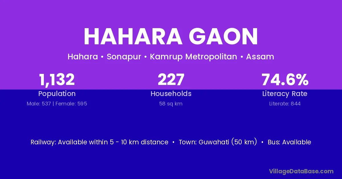 Guwahati (50 km) is the nearest town to Hahara Gaon village for major economic activities and is located approximately 50 km away.