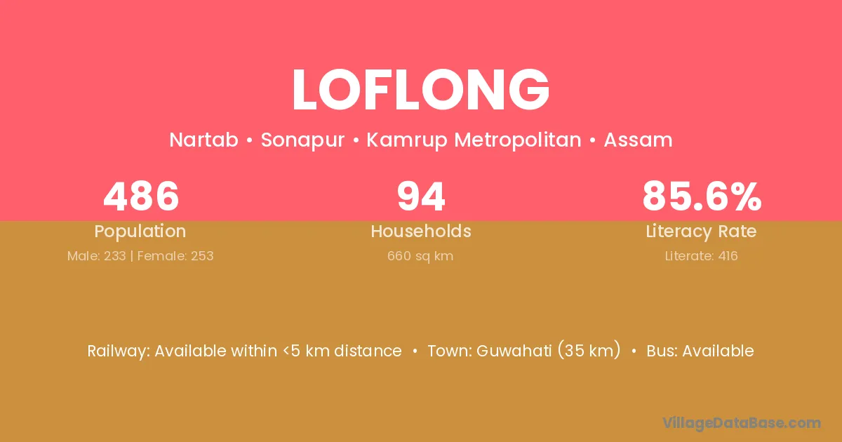 Guwahati (35 km) is the nearest town to Loflong village for major economic activities and is located approximately 35 km away.
