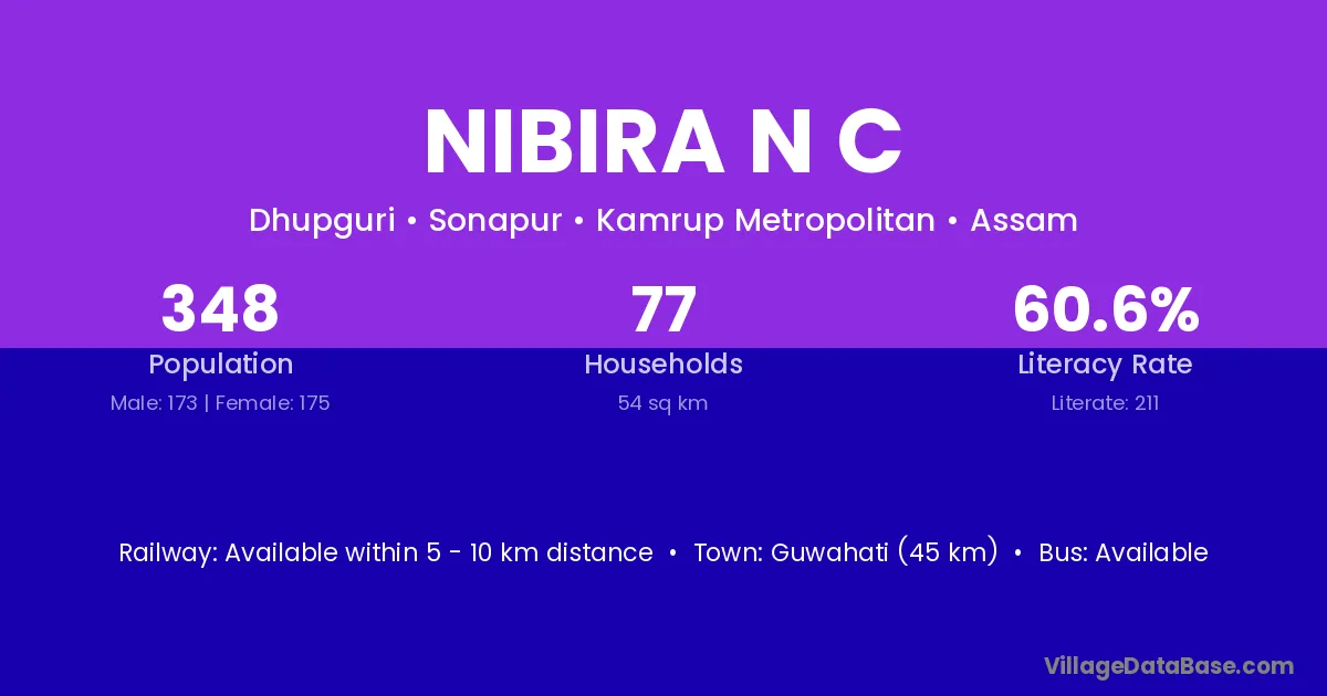 Guwahati (45 km) is the nearest town to Nibira N C village for major economic activities and is located approximately 45 km away.