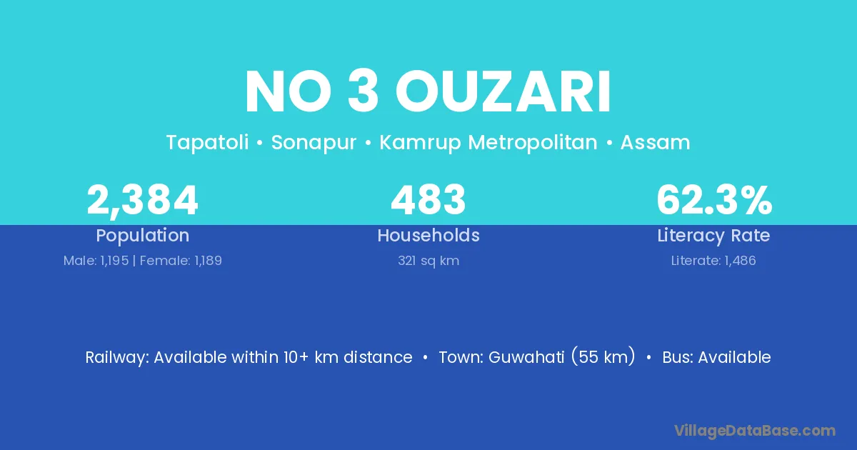 Guwahati (55 km) is the nearest town to No 3 Ouzari village for major economic activities and is located approximately 55 km away.