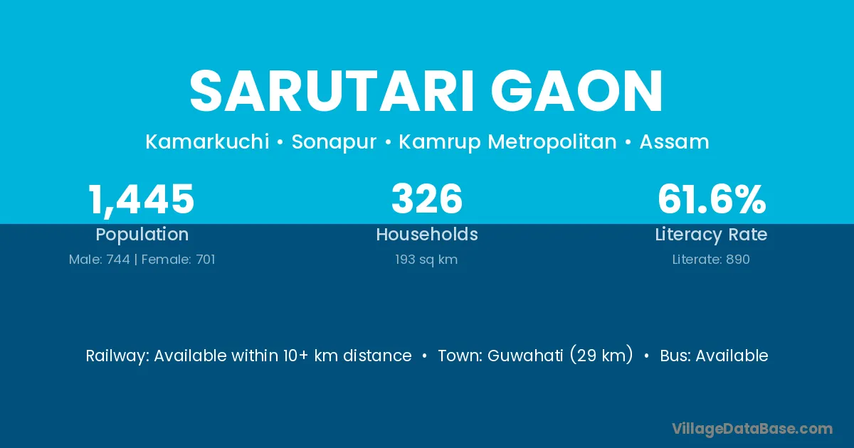 Sarutari Gaon village has a total population of 1,445 people, of which 744 are males and 701 are females.