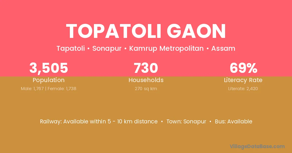 Topatoli Gaon village has a total population of 3,505 people, of which 1,767 are males and 1,738 are females.