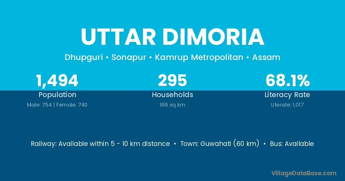 Uttar Dimoria village has a total population of 1,494 people, of which 754 are males and 740 are females.