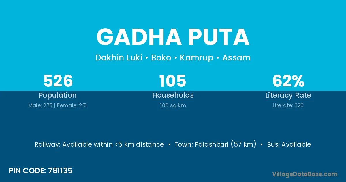 Palashbari (57 km) is the nearest town to Gadha Puta village for major economic activities and is located approximately 57 km away.