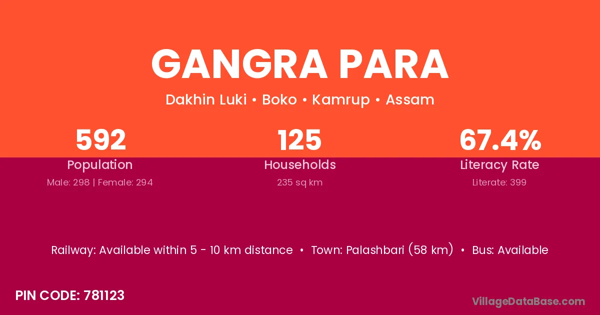 Palashbari (58 km) is the nearest town to Gangra Para village for major economic activities and is located approximately 58 km away.