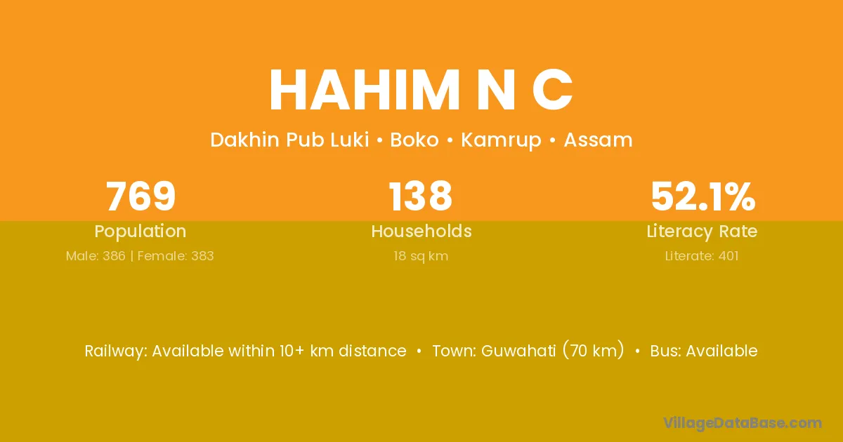 Guwahati (70 km) is the nearest town to Hahim N C village for major economic activities and is located approximately 70 km away.