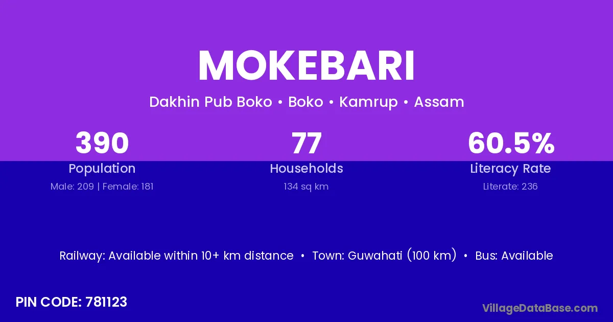 Guwahati (100 km) is the nearest town to Mokebari village for major economic activities and is located approximately 100 km away.