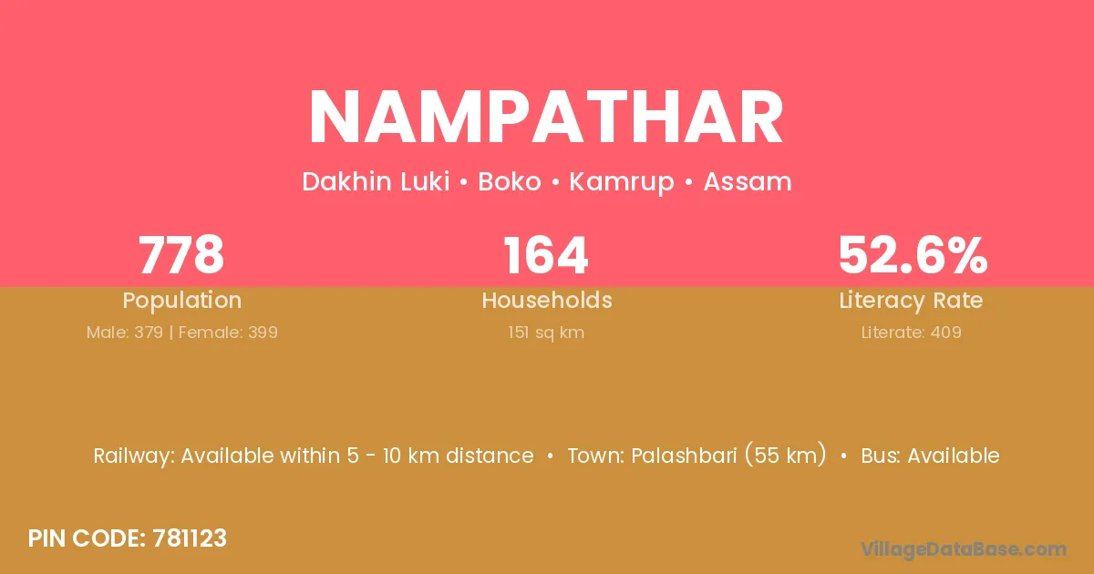 Palashbari (55 km) is the nearest town to Nampathar village for major economic activities and is located approximately 55 km away.