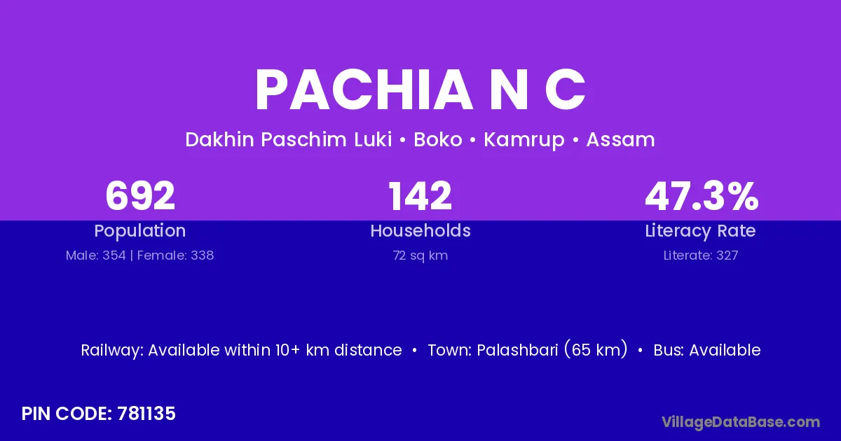 Palashbari (65 km) is the nearest town to Pachia N C village for major economic activities and is located approximately 65 km away.