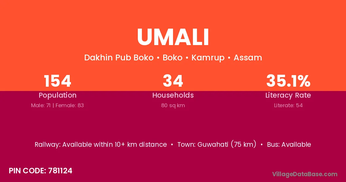 Guwahati (75 km) is the nearest town to Umali village for major economic activities and is located approximately 75 km away.