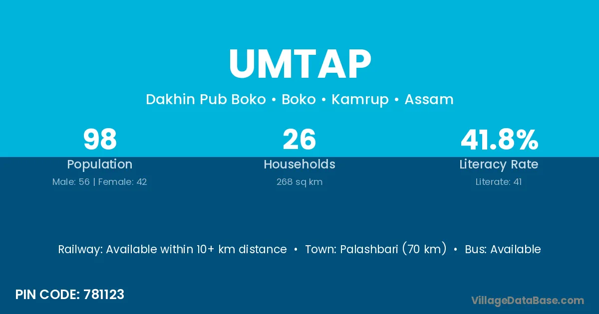 Palashbari (70 km) is the nearest town to Umtap village for major economic activities and is located approximately 70 km away.