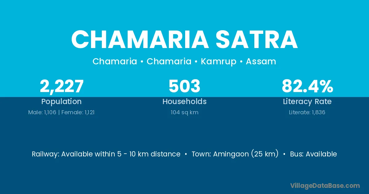 Amingaon (25 km) is the nearest town to Chamaria Satra village for major economic activities and is located approximately 25 km away.