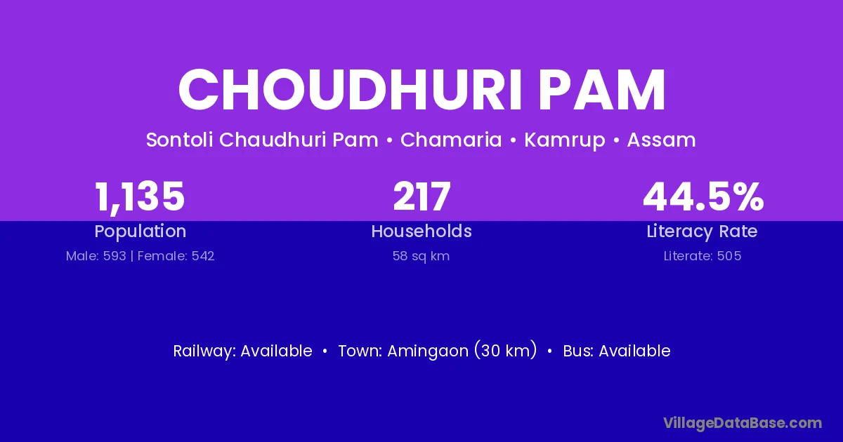 Amingaon (30 km) is the nearest town to Choudhuri Pam village for major economic activities and is located approximately 30 km away.