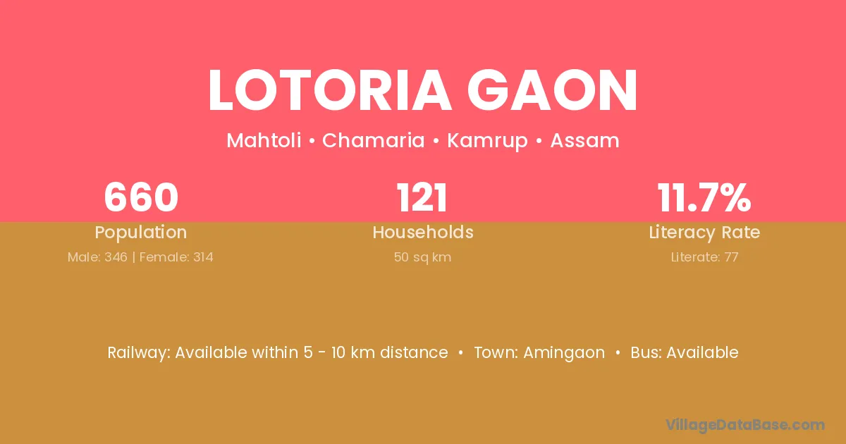 The literacy rate of Lotoria Gaon village is 11.67%. Male literacy stands at 14.45% and female literacy at 8.60%.