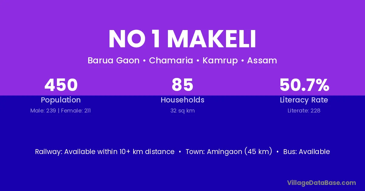 Amingaon (45 km) is the nearest town to No 1 Makeli village for major economic activities and is located approximately 45 km away.