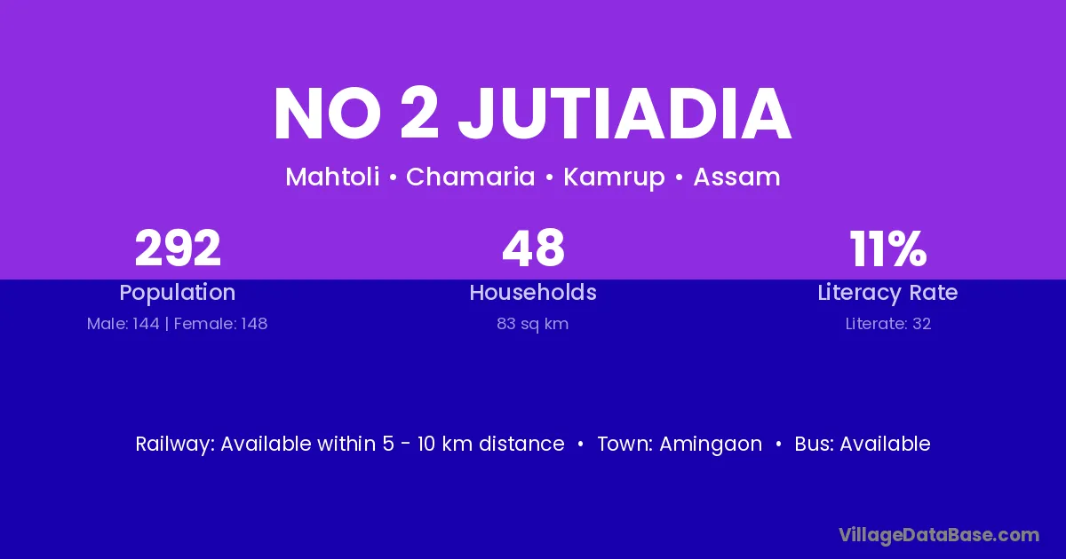 No 2 Jutiadia village has a total population of 292 people, of which 144 are males and 148 are females.