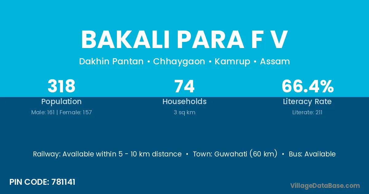 Guwahati (60 km) is the nearest town to Bakali Para F V village for major economic activities and is located approximately 60 km away.