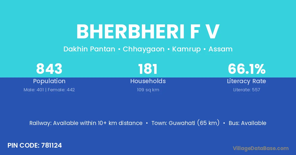 Guwahati (65 km) is the nearest town to Bherbheri F V village for major economic activities and is located approximately 65 km away.