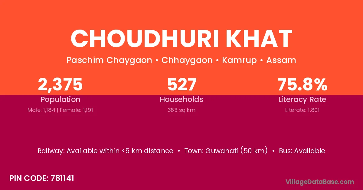 Guwahati (50 km) is the nearest town to Choudhuri Khat village for major economic activities and is located approximately 50 km away.