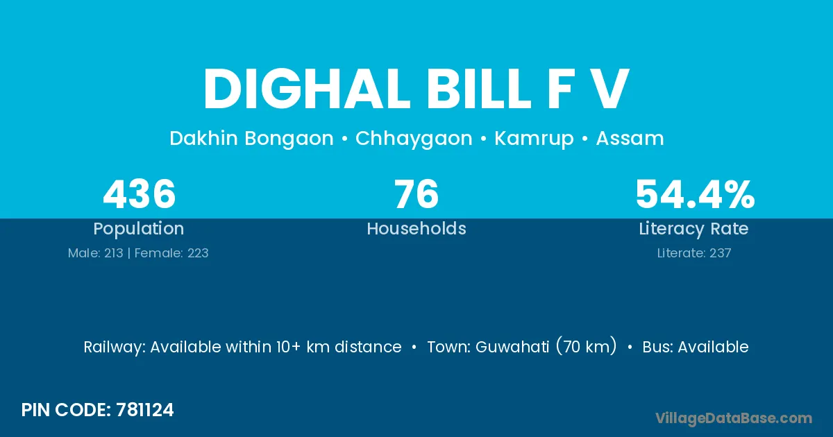 Guwahati (70 km) is the nearest town to Dighal Bill F V village for major economic activities and is located approximately 70 km away.