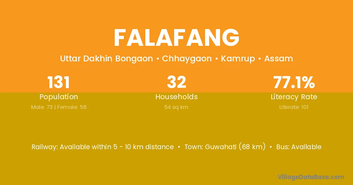 Guwahati (68 km) is the nearest town to Falafang village for major economic activities and is located approximately 68 km away.