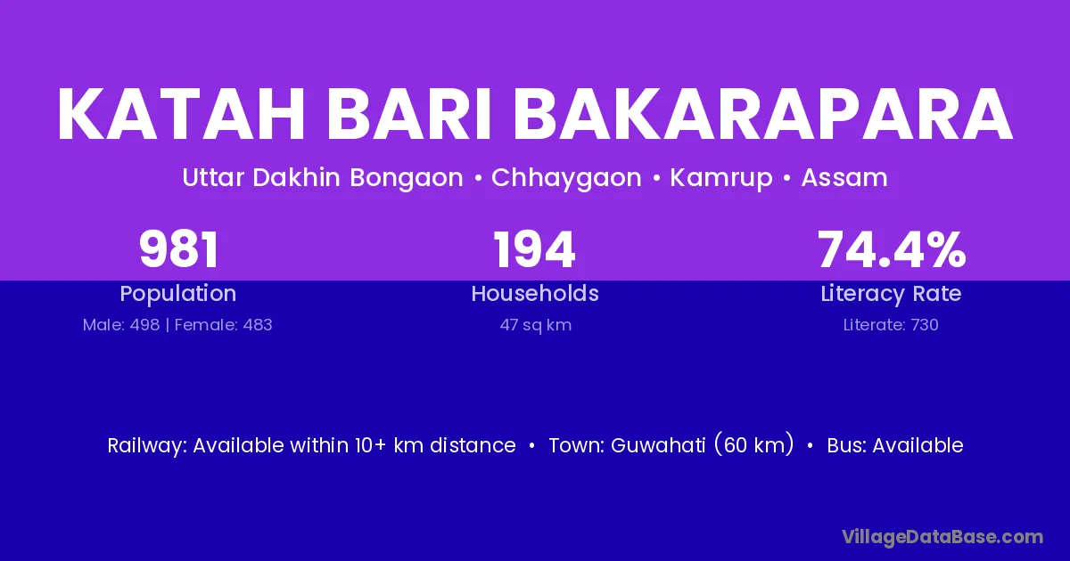 Guwahati (60 km) is the nearest town to Katah Bari Bakarapara village for major economic activities and is located approximately 60 km away.