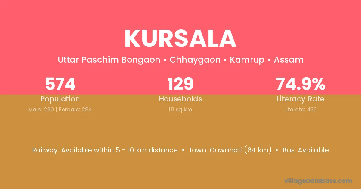 Guwahati (64 km) is the nearest town to Kursala village for major economic activities and is located approximately 64 km away.