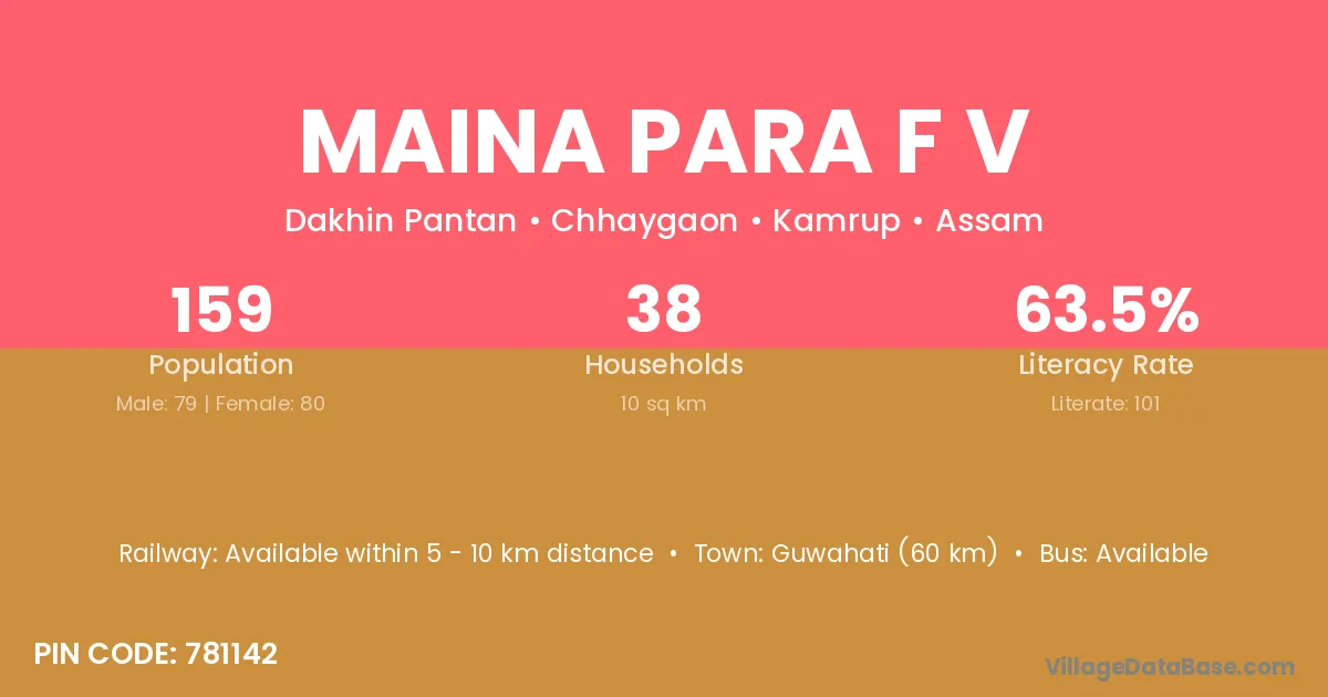 Guwahati (60 km) is the nearest town to Maina Para F V village for major economic activities and is located approximately 60 km away.