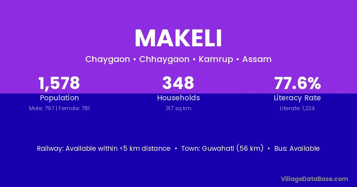 Guwahati (56 km) is the nearest town to Makeli village for major economic activities and is located approximately 56 km away.