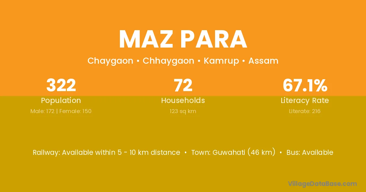Guwahati (46 km) is the nearest town to Maz Para village for major economic activities and is located approximately 46 km away.
