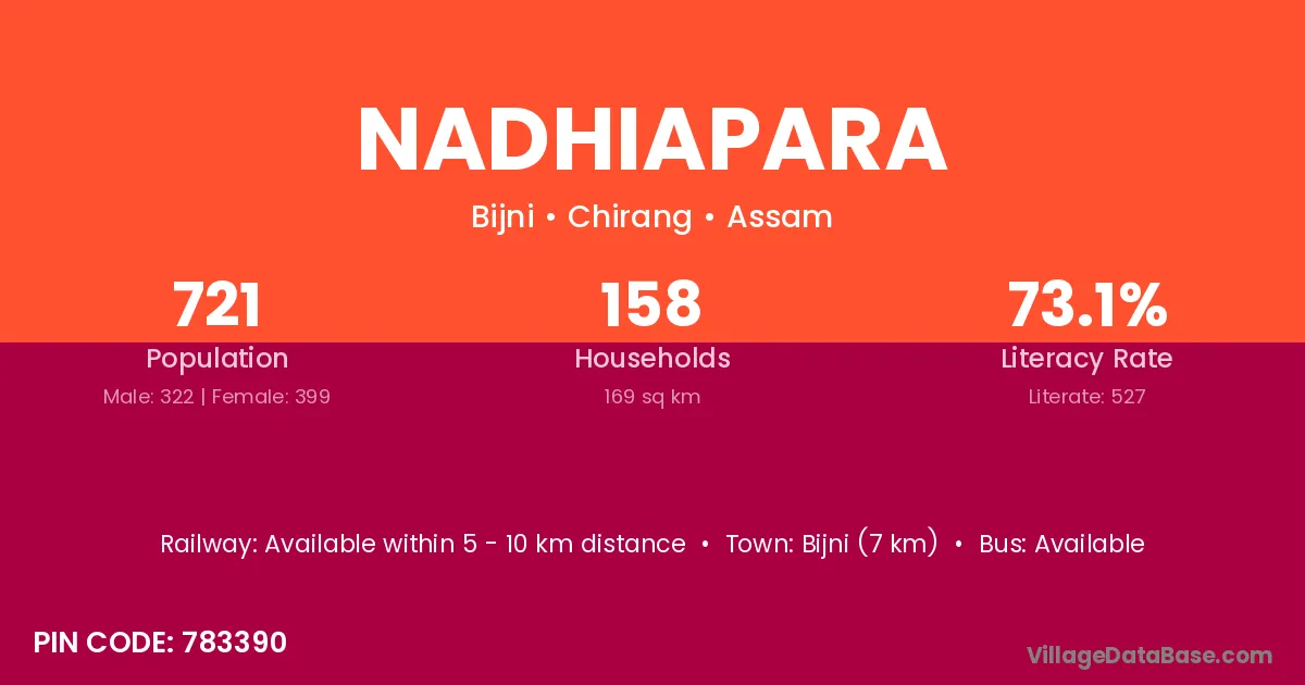 Guwahati (70 km) is the nearest town to Nadhiapara village for major economic activities and is located approximately 70 km away.
