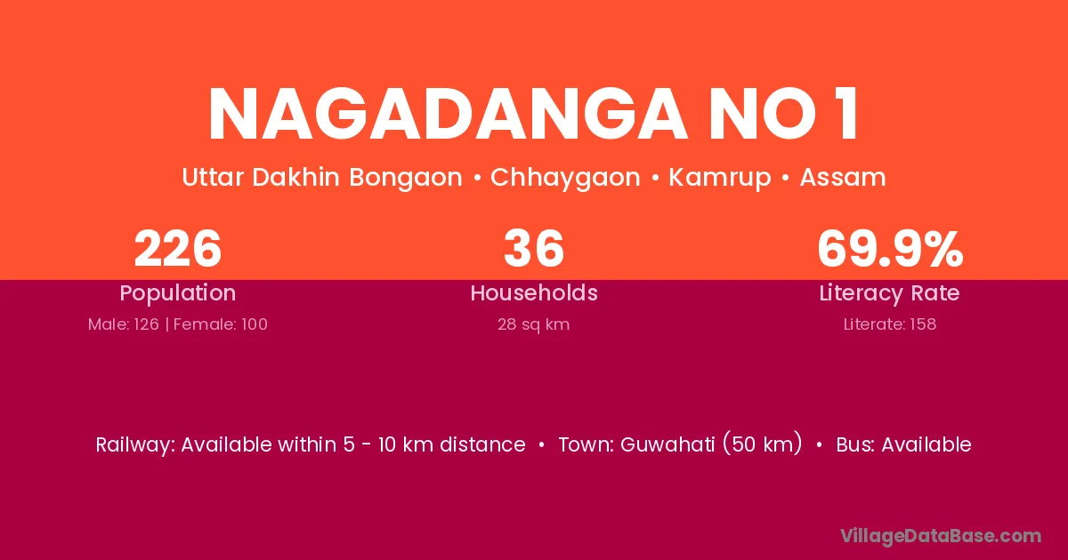 Guwahati (50 km) is the nearest town to Nagadanga No 1 village for major economic activities and is located approximately 50 km away.