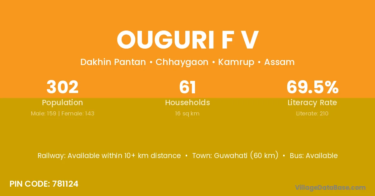 Guwahati (60 km) is the nearest town to Ouguri F V village for major economic activities and is located approximately 60 km away.