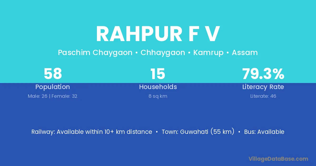 Guwahati (55 km) is the nearest town to Rahpur F V village for major economic activities and is located approximately 55 km away.