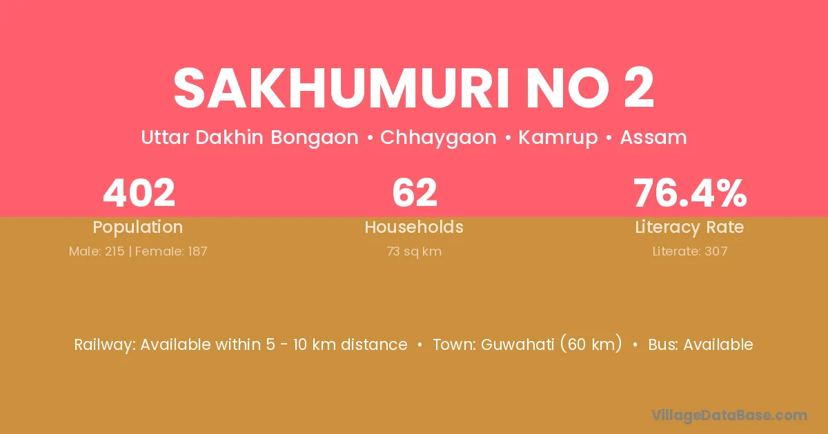 Guwahati (60 km) is the nearest town to Sakhumuri No 2 village for major economic activities and is located approximately 60 km away.